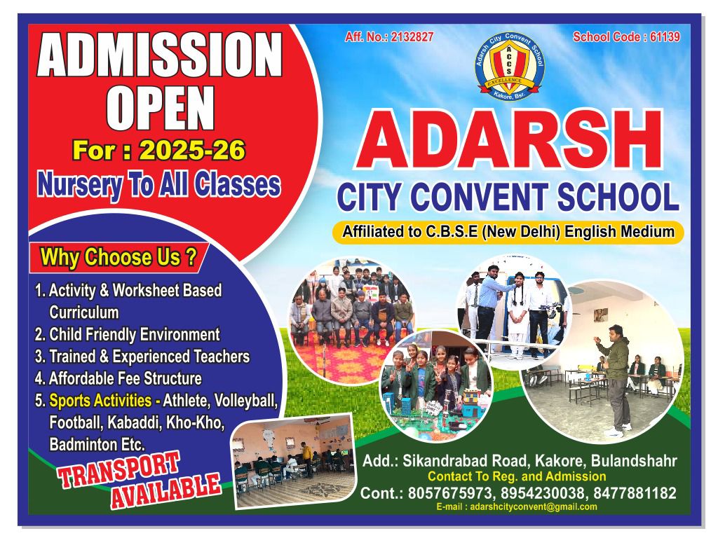Adarsh City Convent School is a Secondary School affiliated to CBSE(Delhi) run by Adarsh Shiksha Samiti , Bulandshahr with the aim of providing quality education.